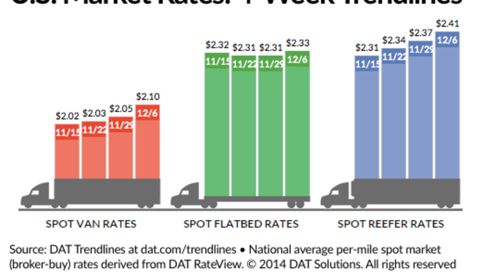 Reefers posted the biggest gain, 1.1% for Nov. 23 through Nov. 29 compared to the previous seven days, for an average of $2.37 per mile, its best showing out of the last four weeks.