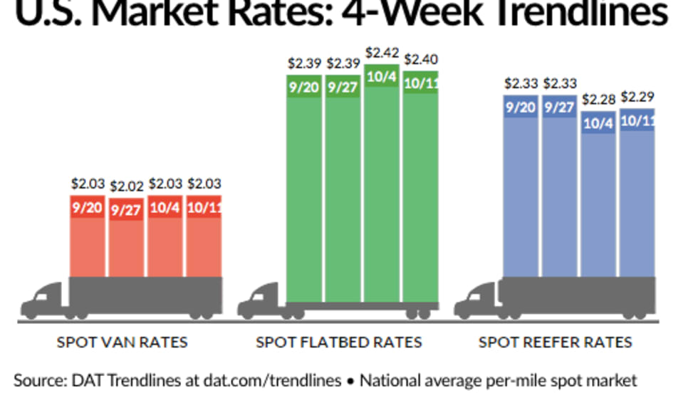The amount of spot market freight has rebounded from last week, while rates in two out of three categories has also recovered. The freight-matching service provider DAT Solutions reports the number of loads available increased 1.5% Sept. 28 through Oct. 4 compared to the previous seven days, as spot market capacity fell by 4.3%.