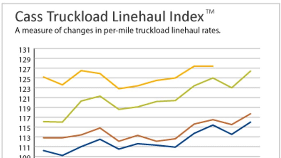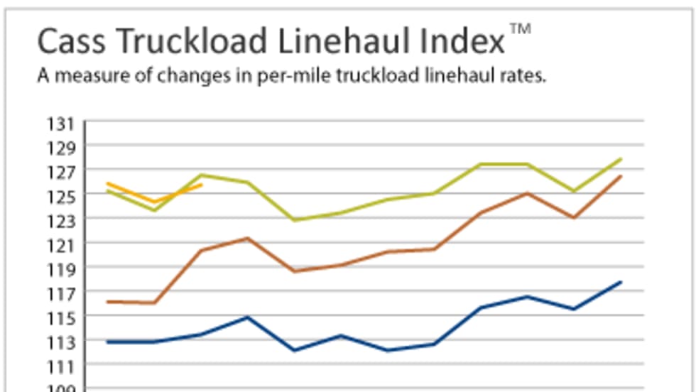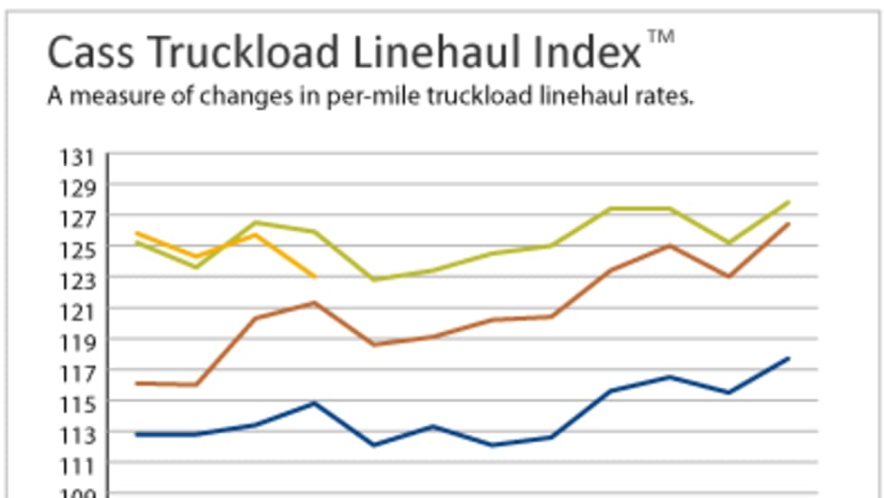 Truckload linehaul freight rates have fallen again and are barely higher than a year ago, while rates for intermodal shipments have dropped for the 14th straight month, according to the latest Cass indexes.
