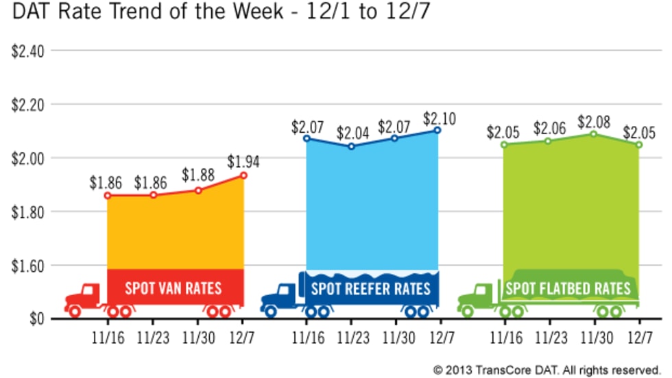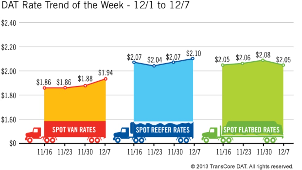Van rates on the spot market surged the first week of December, according to the freight-matching service provider DAT. Total spot market loads available increased 16% and spot market capacity increased 5.2%, while load-to-truck ratios increased across the board.