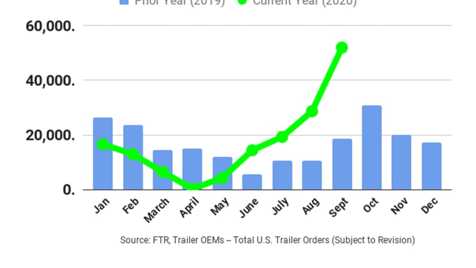 According to preliminary reports from FTR, September’s U.S. net trailer orders hit a third-highest-month-ever record at 52,000 units, 23,500 units above August and 33,400 more than September 2019.