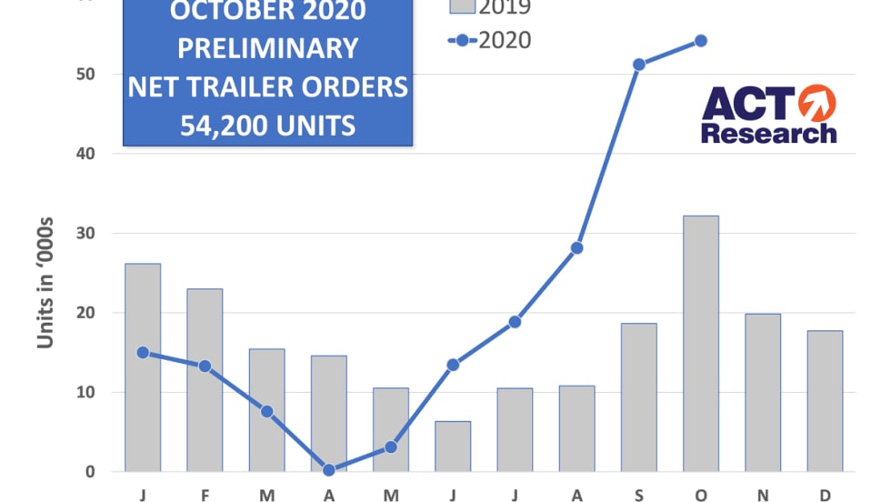 According to ACT Research, preliminary trailer data for October shows a total of 54,200 orders, up 6% from September and more than 68% higher than October 2019.