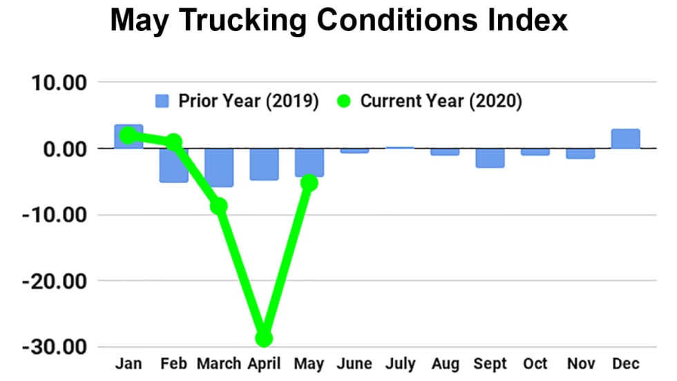 While FTR’s Trucking Conditions Index reading for May made a comeback from a “worst-ever” level in April to a reading of -5.19, it is still not doing well from a historical perspective.