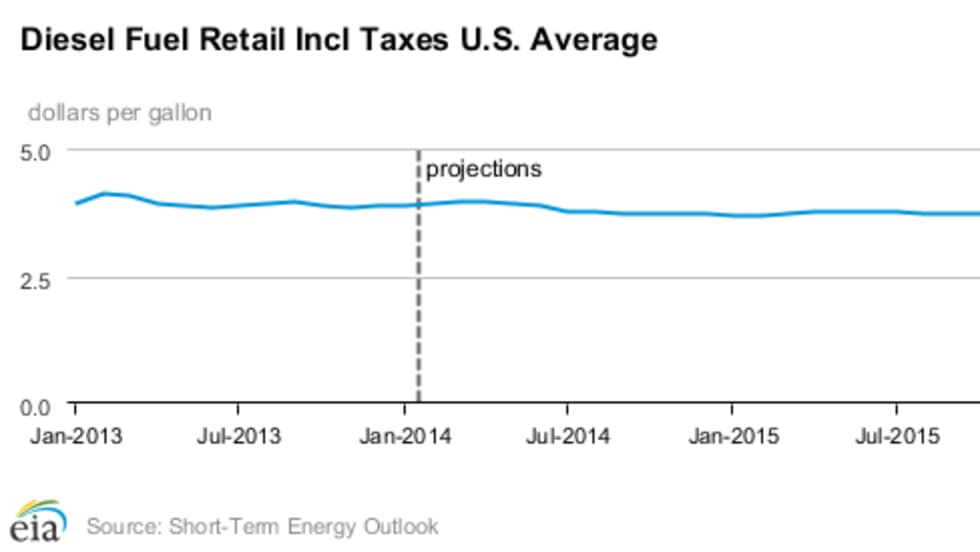The U.S. Energy Department projects lower prices for diesel fuel this year and in 2015 compared to the average cost in 2013, according to its just-released Short-Term Energy Outlook.