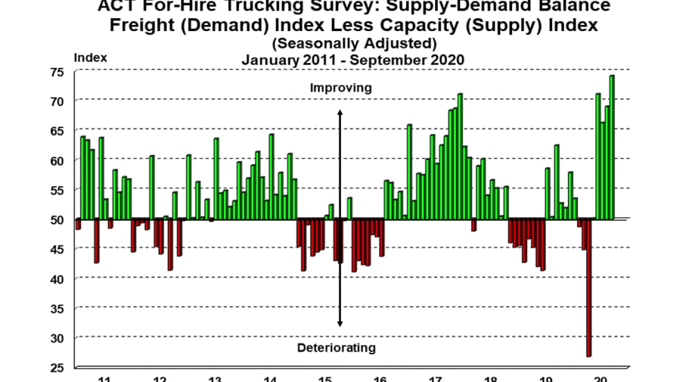ACT’s most recent For-Hire Trucking Index shows a tight trucking market, with continuing increases in volume and rates, but with driver availability worsening.