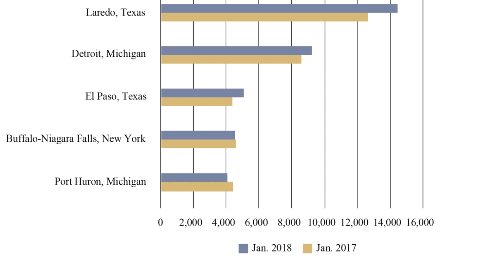 Trucks moved freight valued at $60.6 billion between the U.S. and its North American neighbors Canada and Mexico in January, up 10.2% compared to January 2017, according to newly released Transportation Department figures.