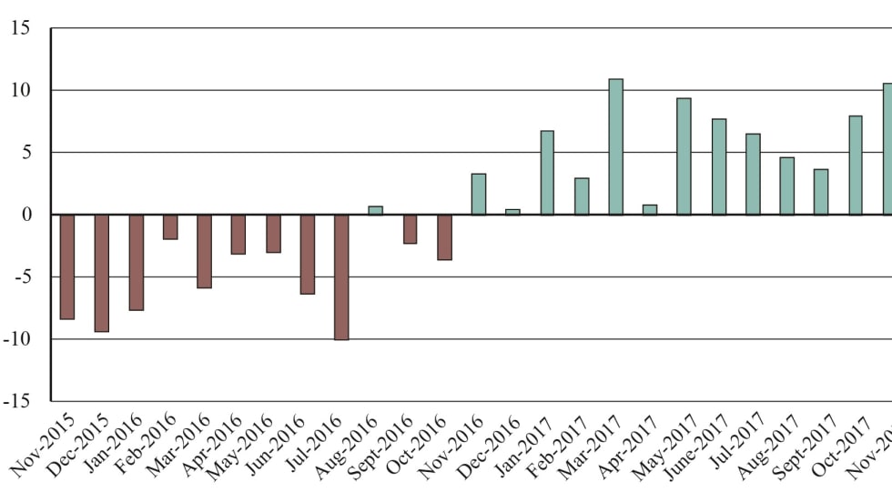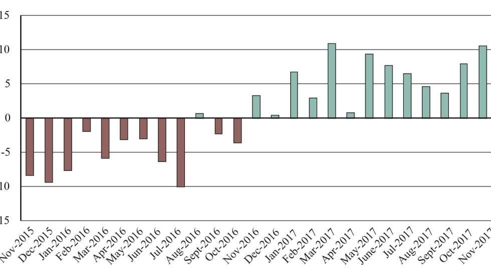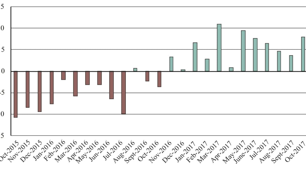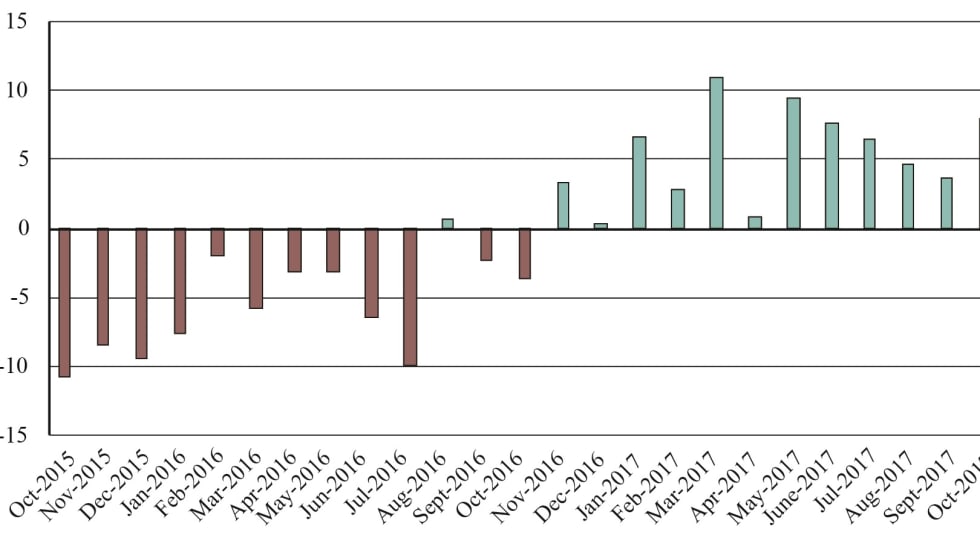 The value of freight moved between the U.S. and its North American Free Trade Agreement partners posted its 12th consecutive year-over-year increase in October, according to newly released Transportation Department figures.