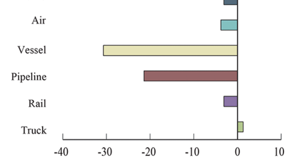 A new Transportation Department report shows trucks carried more U.S. freight by value with its NAFTA partners, Canada and Mexico, in May compared to the year before. But declines in all other freight modes led to a 3.1% decrease in the dollar value of cross-border freight, totaling $89 billion.