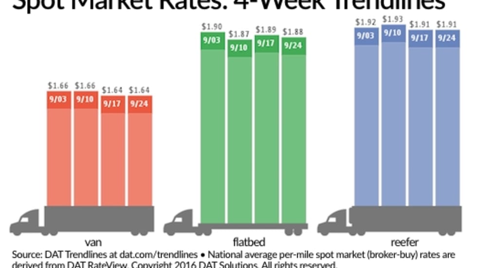 As the West Coast feels ripple effects from the bankruptcy of Hanjin Shipping Co., nationally the number of loads on the spot truckload freight market fell 5% during the week ending Sept. 24 compared to the week before as truck capacity increased 3%, according to DAT Solutions, its network of load boards.