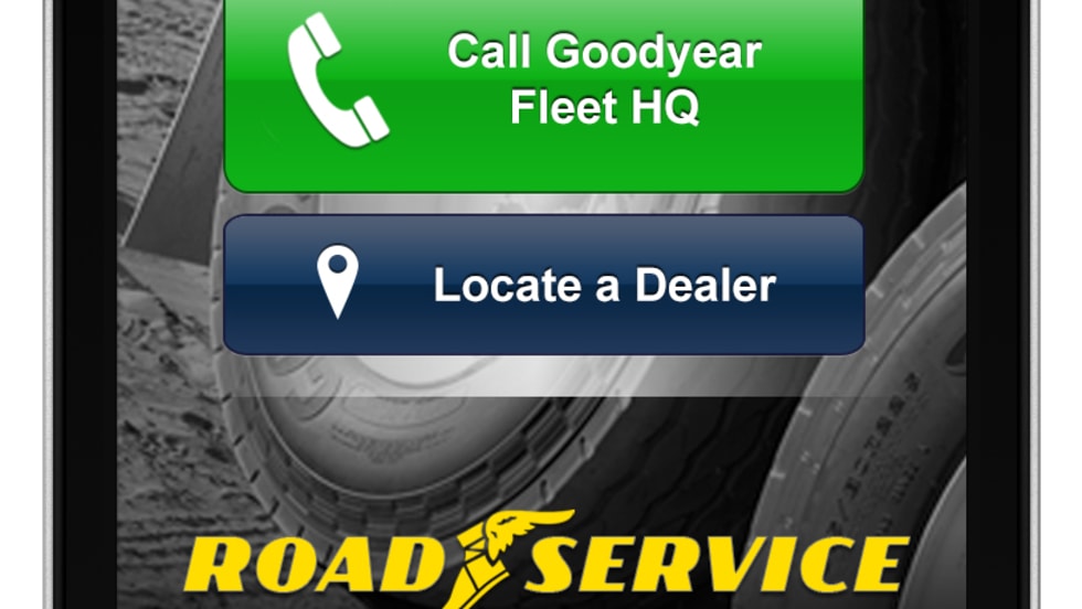 The new The Goodyear RoadService App expedites the emergency road service call process in order to help get trucks up and running again quickly. With a touch of the screen, a driver will be placed in contact with the 24/7 Goodyear-FleetHQ Solution Center, where trained tire professionals will collect vital information, including the location of the driver’s immobilized truck.