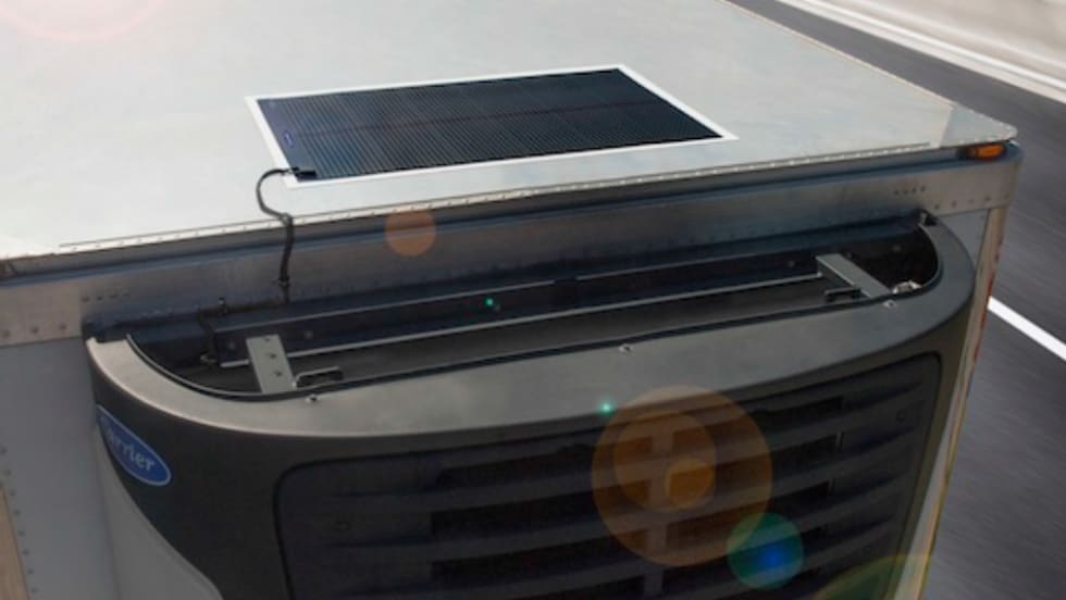 Carrier Transicold’s new Thin-Film Flexible Solar Panels can be installed on the roof of a trailer or truck to continuously charge transport refrigeration unit batteries.