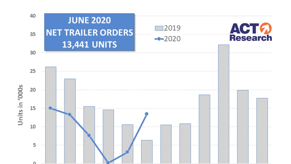 According to ACT Research, U.S. trailer orders in June totaled 13,441 units, a more than 300% jump from May’s total of a little more than 3,100 trailers and 112% higher than June 2019’s level of around 6,200 units.