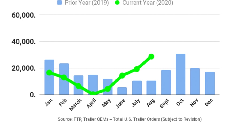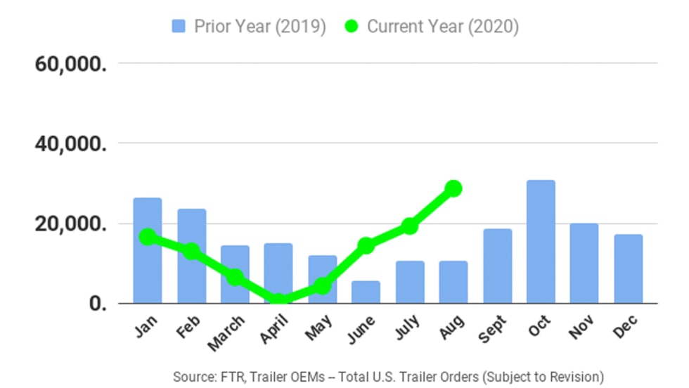 According to FTR, preliminary U.S. trailer orders for August increased 49% since July to 28,700 units, the biggest jump since October 2019.
