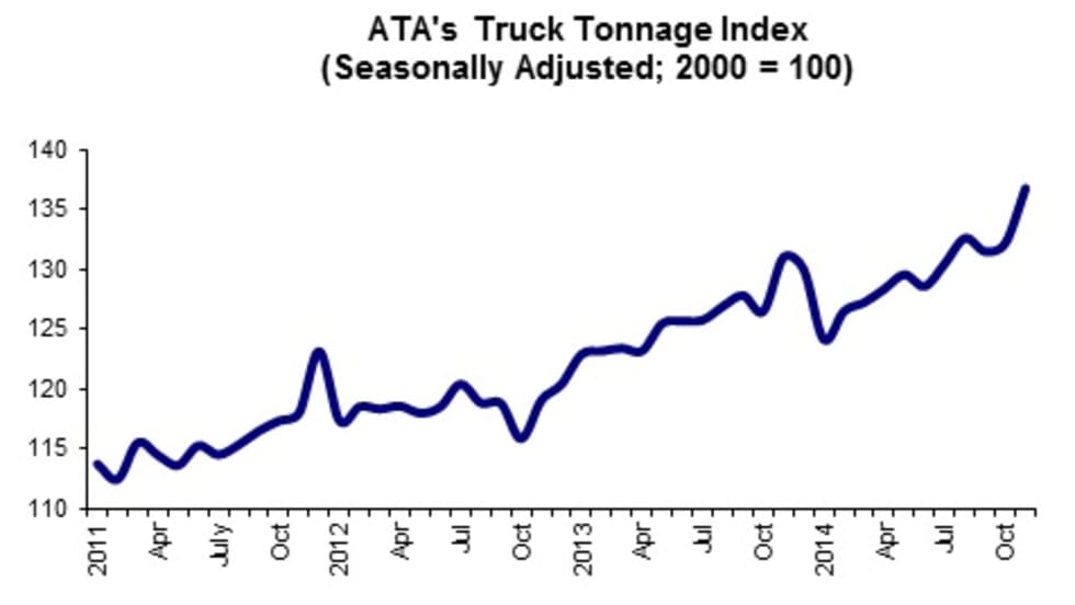 The American Trucking Associations’ seasonally adjusted For-Hire Truck Tonnage Index rose 3.5% to 136.8 in November -- the highest level on record.
