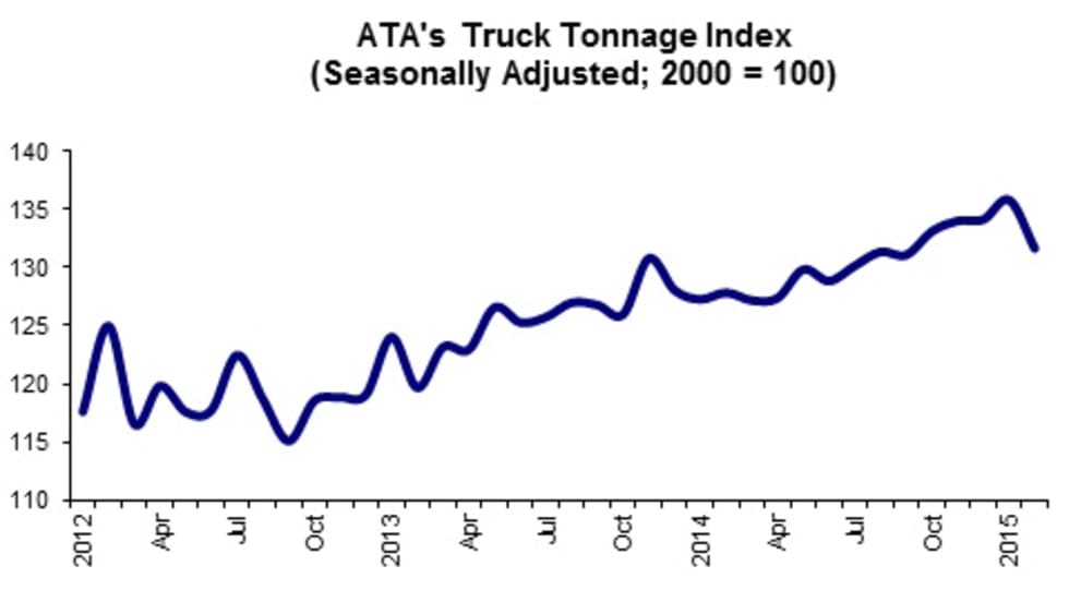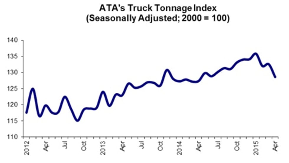 American Trucking Associations’ seasonally adjusted For-Hire Truck Tonnage Index fell 3% to 128.6 in April to the lowest level in a year.