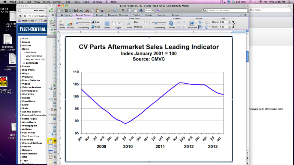 Commercial Motor Vehicle Consulting's CV Parts Aftermarket Leading Indicator decreased 0.2% in November to 100.82 following 0.3% decrease in October. The downturn in PLI is moderating and appears to bottoming out as the slowing of fleet cyclical factors has abated and some factors, such as industrial production, have recently moderately accelerated.