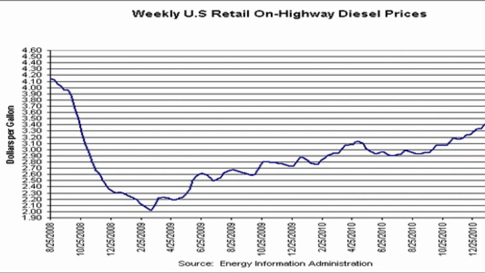 As crude oil futures hit a new 29-month high Monday, diesel prices took another big leap this week, 15.5 cents, to a national average of $3.871 per gallon, according to the U.S. Department of Energy. That's the 14th hike in a row and nearly 97 cents higher than it was a year ago