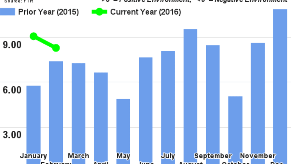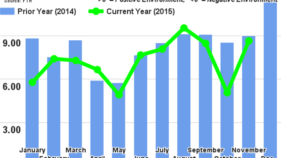 The November FTR Trucking Conditions Index jumped by more than three points to a reading of 8.64, possibly pointing to improvements for truckers in 2016, according to FTR.