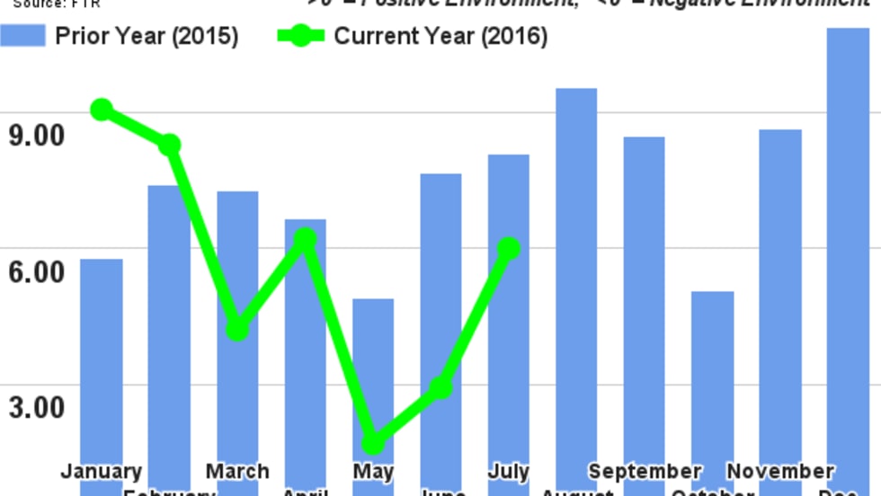FTR’s Trucking Conditions Index improved in July reflecting improved market prospects as a result of moderate economic growth and a regulatory environment that is tightening capacity.