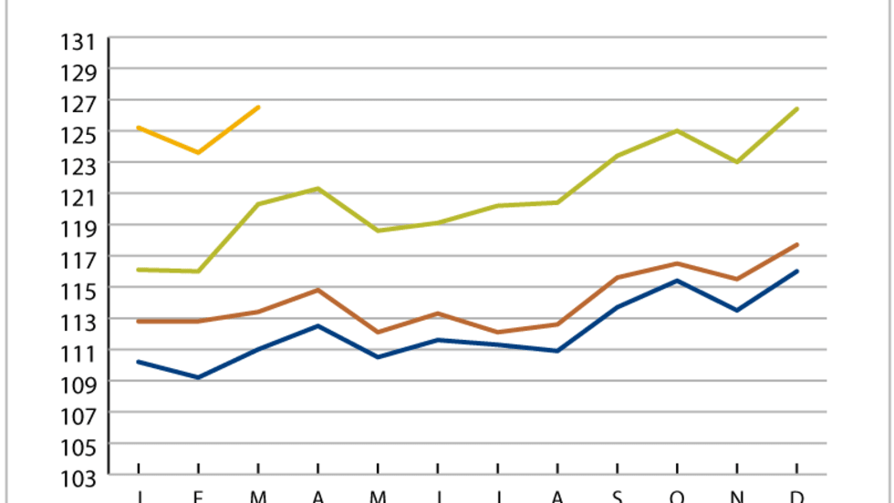 A measure of truckload rates shows it hitting an all-time high in March, increasing 5.1% from the same time a year ago.