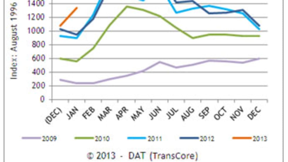 Reaching the highest-ever volume for the month of January, the DAT North American Freight Index increased 42% last month compared to January 2012. Freight volume was unusually robust for the season, exceeding December levels by 24%