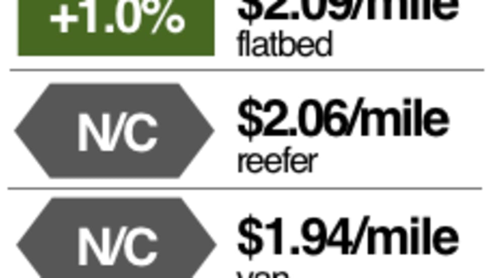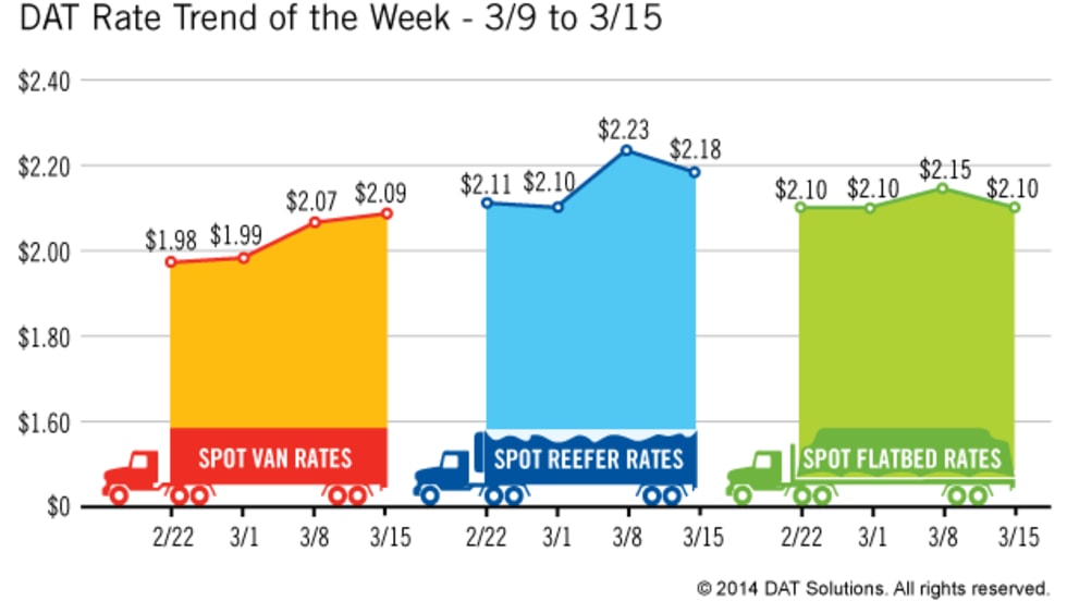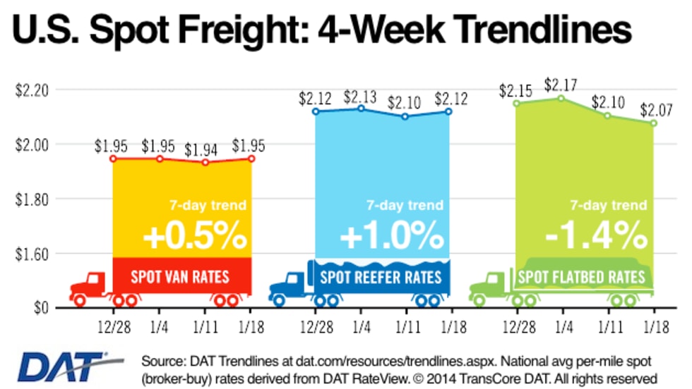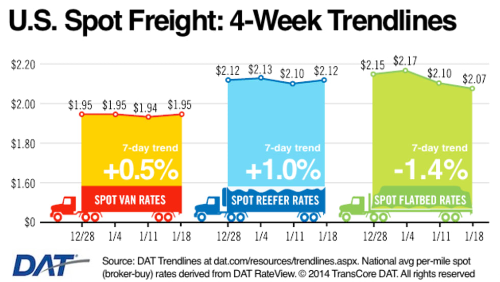 Newly released figures from the freight-matching service provider DAT show rates on the spot market are down slightly over the past week in two the three major categories and while it unchanged in another.