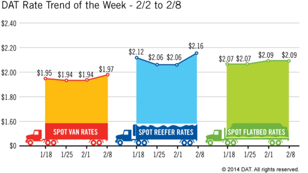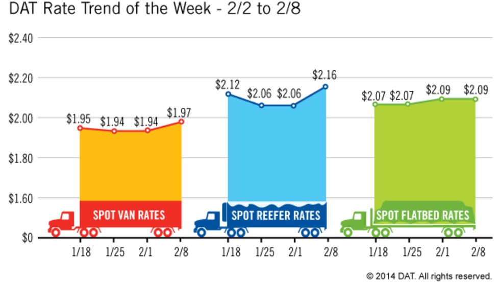 Recurring storms and strong month-end demand for capacity helped keep rates elevated on the spot truckload market during the week ending Feb. 1 compared to the previous seven days, according to a composite of the DAT network of load boards.