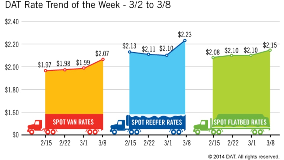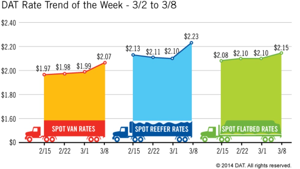 Freight rates and the number of load available on the spot market posted impressive gains over the past week, according to just released numbers from the freight-matching service provider DAT.