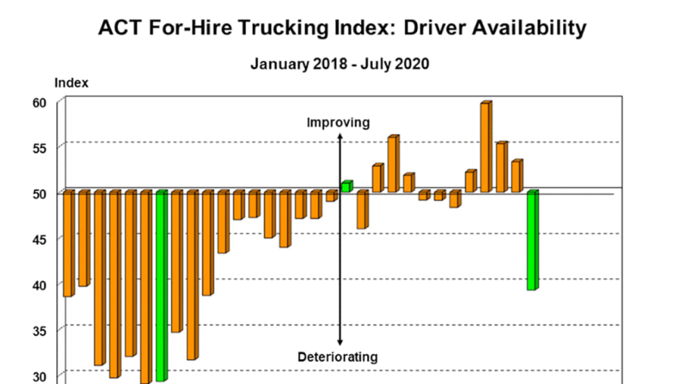 ACT’s For-Hire Trucking Index for last month showed an about-face from the record surge in June, falling six points to 64.3, while pricing and productivity were at 60.3 and 61.5, respectively.