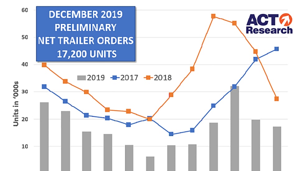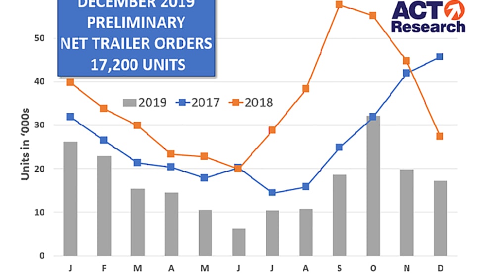 Preliminary reports indicate trailer orders for December were down from the previous month and significantly down from the same time last year, according to ACT Research and FTR estimates.