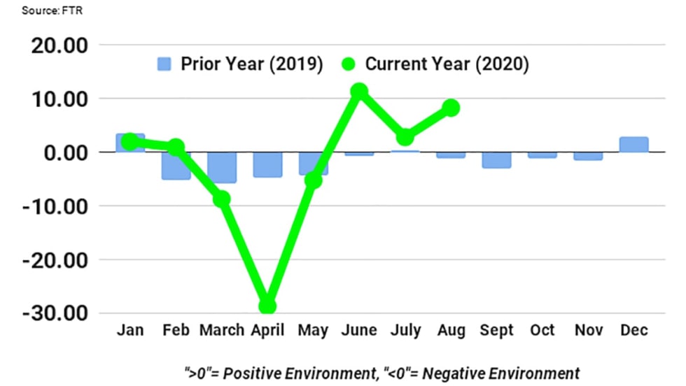 According to FTR’s Trucking Conditions Index for August, carriers saw a positive rate environment with reading of 8.31.