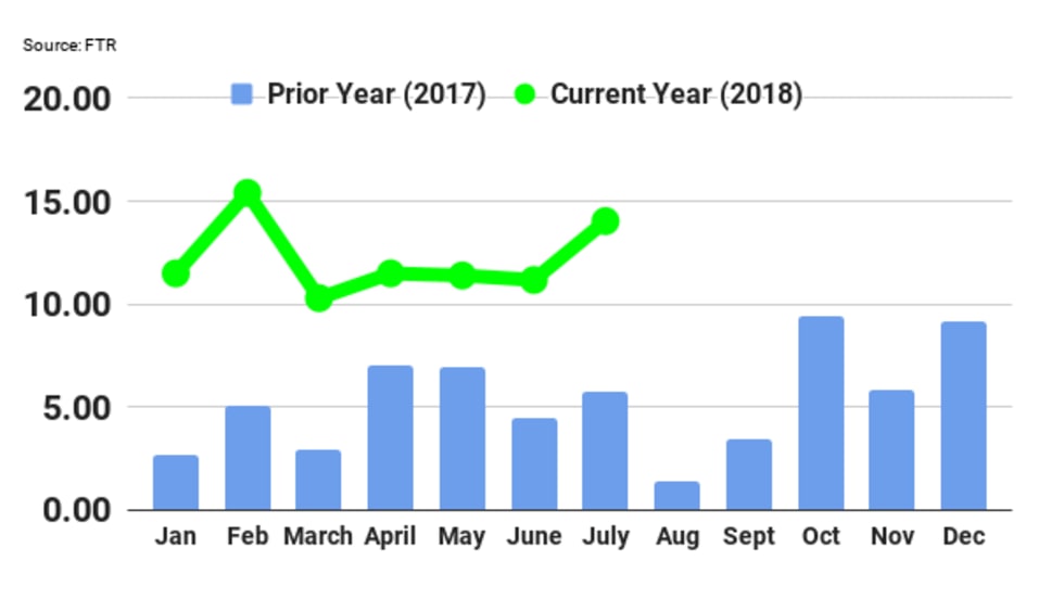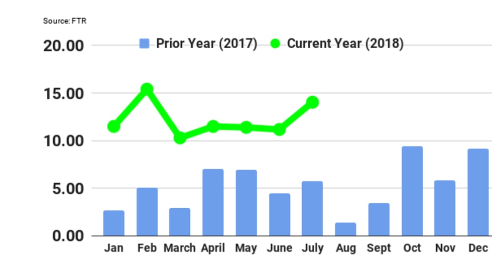 FTR’s Trucking Conditions Index spiked in July reflecting the pro-carrier freight environment that is likely to remain throughout 2018.
