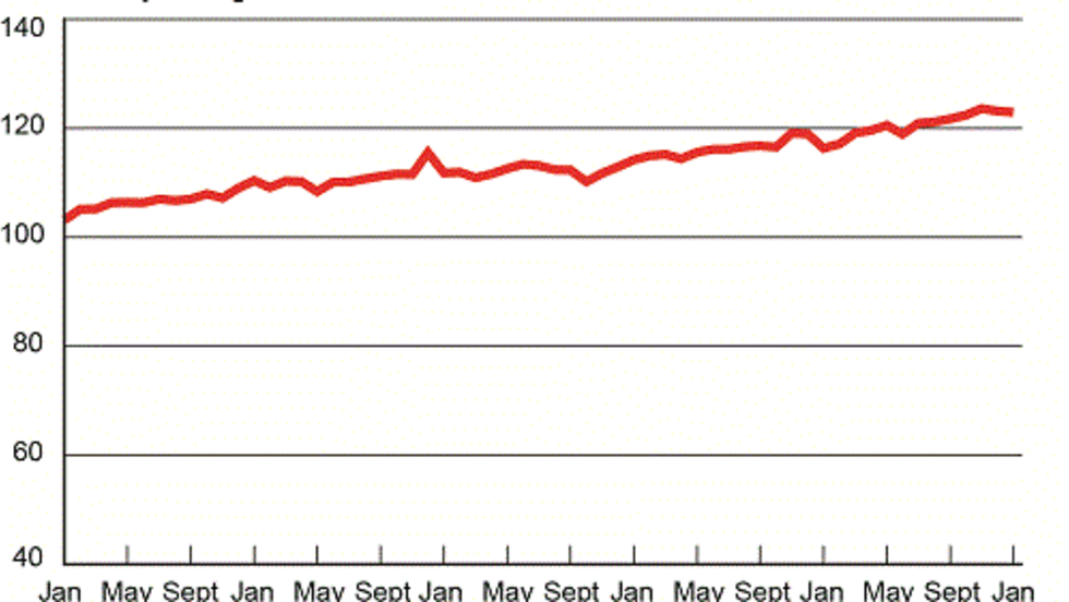 The amount of freight moved by the nation’s for-hire transportation industry fell slightly in January from the month before, but remains close to its record high level.