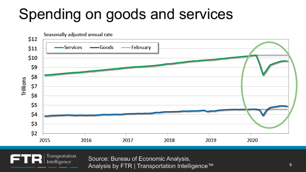 As the COVID-19 vaccine helps return life to normal later in the year, the effect on trucking freight and rates will vary as consumer spending is expected to shift back toward services. That’s one takeaway from the transportation analysts at FTR in a recent webinar, “Preparing for 2021.”