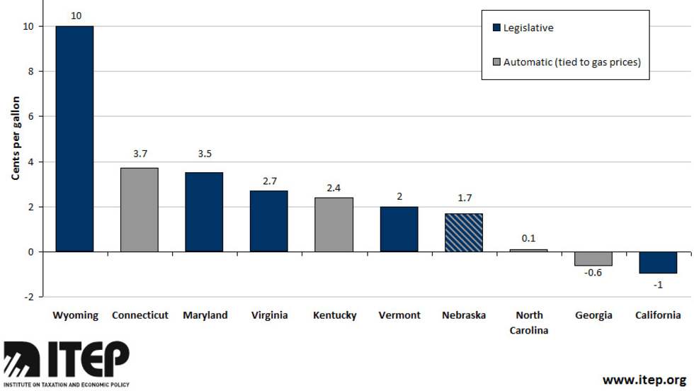 Diesel and gasoline taxes will change in 10 states on July 1, with most of them heading higher, according to an analysis by the Institute on Taxation and Economic Policy.