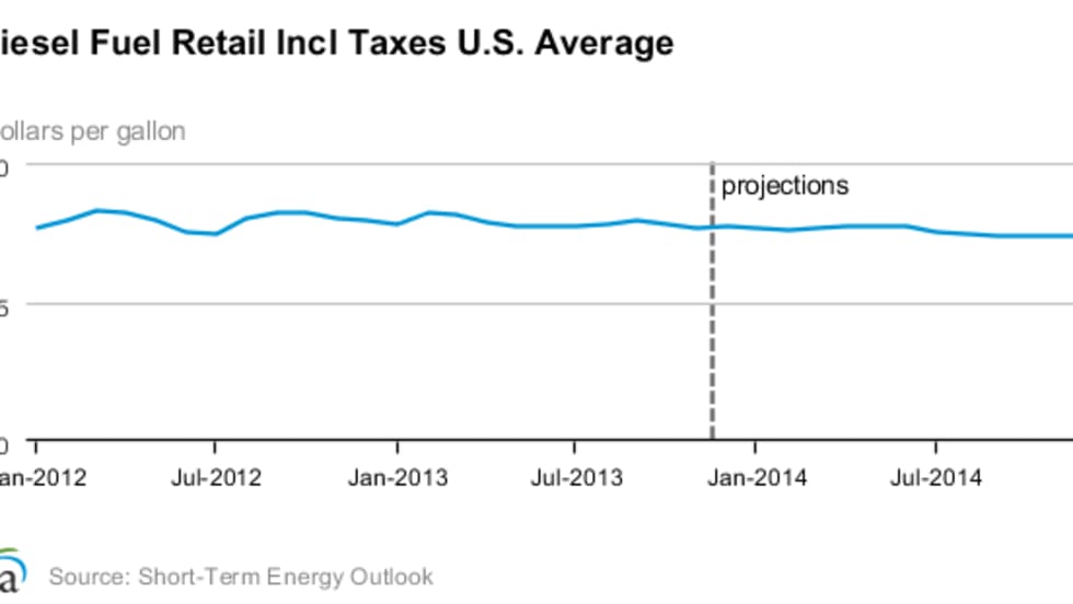 Look for fuel prices to be lower next year, according to a new report from the U.S. Energy Department’s Energy Information Administration. It forecasts diesel fuel prices, which averaged $3.97 per gallon in 2012, are projected to average $3.92 per gallon this year and $3.77 per gallon in 2014