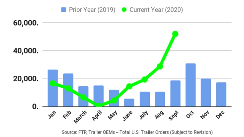 According to preliminary reports from FTR, September’s U.S. net trailer orders hit a third-highest-month-ever record at 52,000 units, 23,500 units above August and 33,400 more than September 2019.