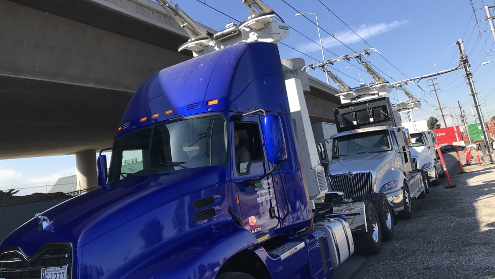 Siemens has begun testing a zero-emissions highway concept in California that allows trucks to use diesel engines part of the time and run on electric power supplied by overhead power lines to save fuel and reduce emissions.