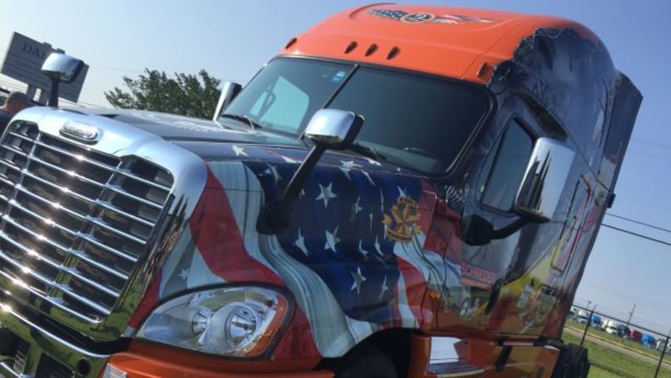 As part of a program founded in 2002, Daimler Trucks North America presented the 2016 Ride of Pride truck to Schneider during a special ceremony commemorating military veterans