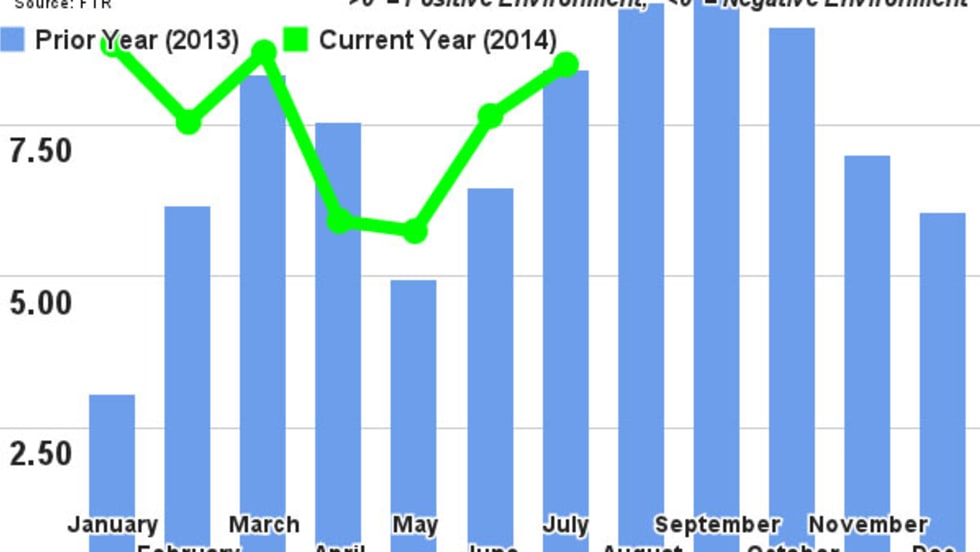 FTR’s Trucking Conditions Index increased to a reading of 8.49 for July, one of the highest points this year. The high values reflect rising prices and service lapses caused by the current capacity crisis. FTR says the TCI could go even higher this fall if the economy accelerates as expected.
