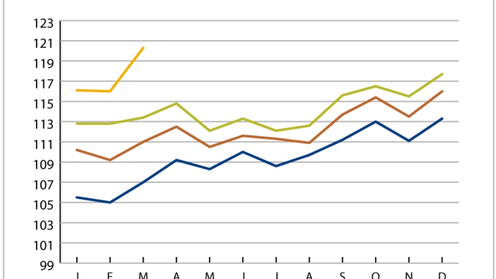 Truckload linehaul rates spiked in March, with the Cass Truckload Linehaul Index surpassing the 120 mark, showing a 6% year-over-year increase.