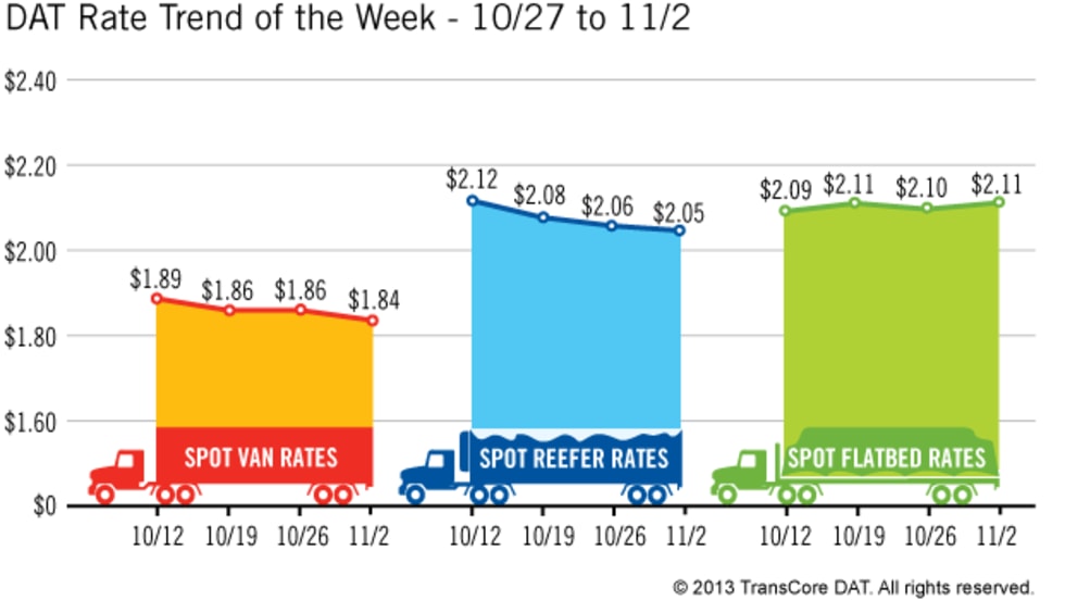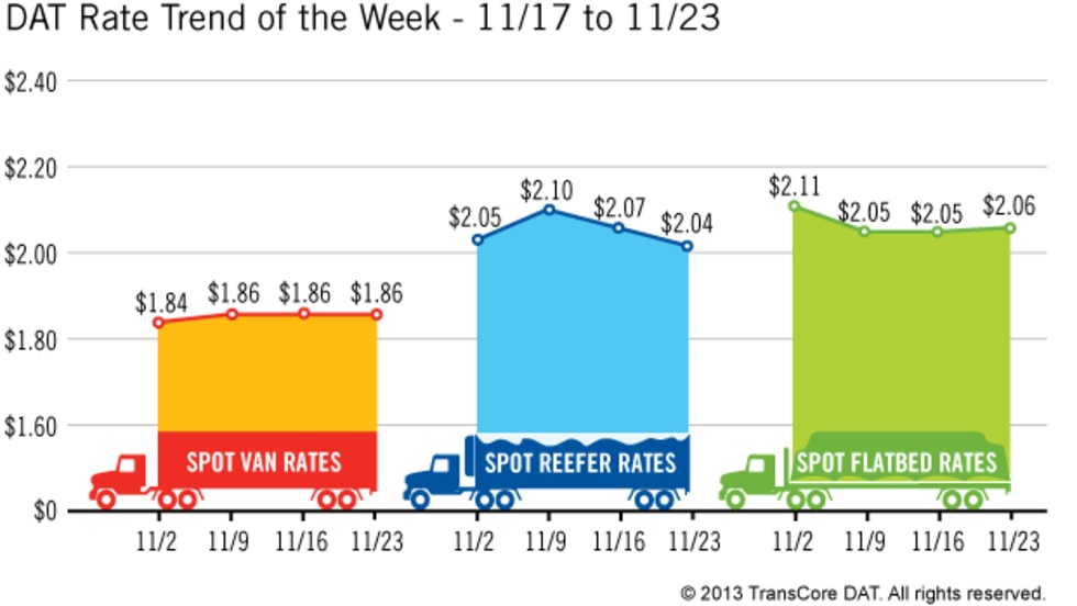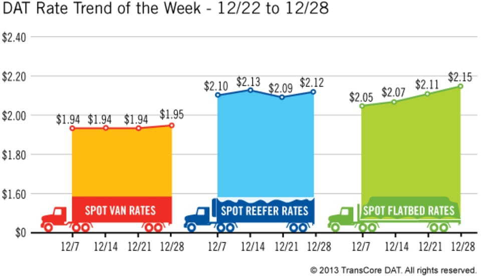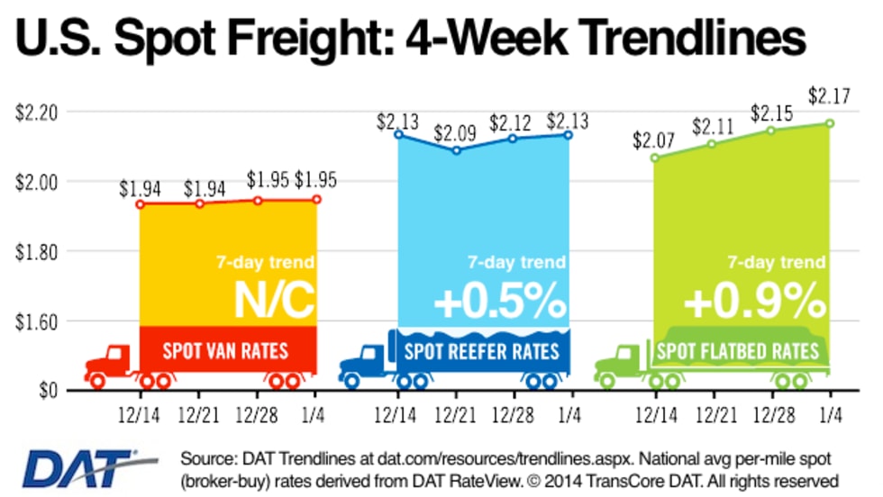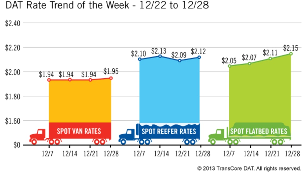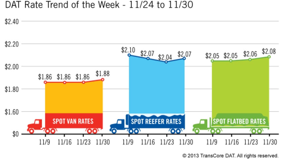 Rates in the three major categories on one of the nation’s leading spot markets for freight increased or held steady over the past week, according to newly released figures.