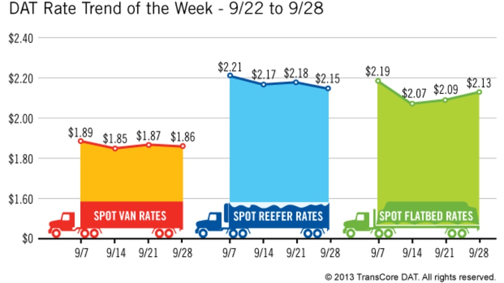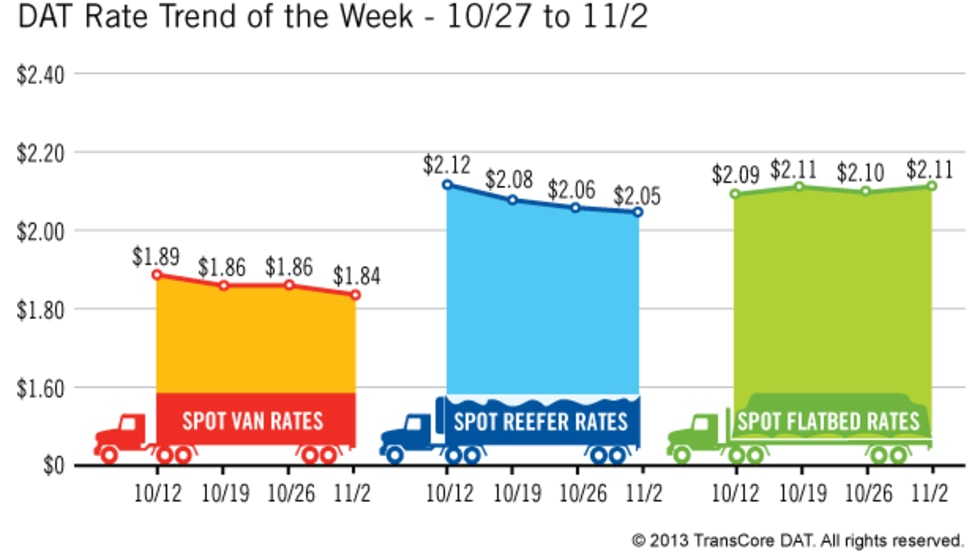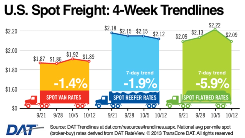 The amount of cargo to haul and rates paid for it, on one of the nation's largest spot markets, has declined across the board during the most recent seven-day period.