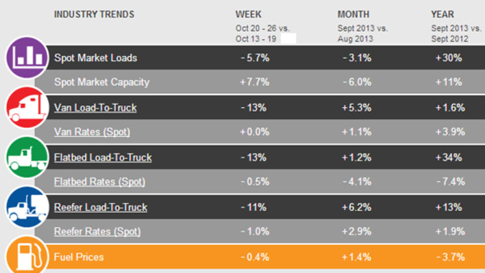 New figures from the freight matching service provider, DAT, show spot market load availability fell 5.7% Oct. 20 through 26, compared to the previous seven days.