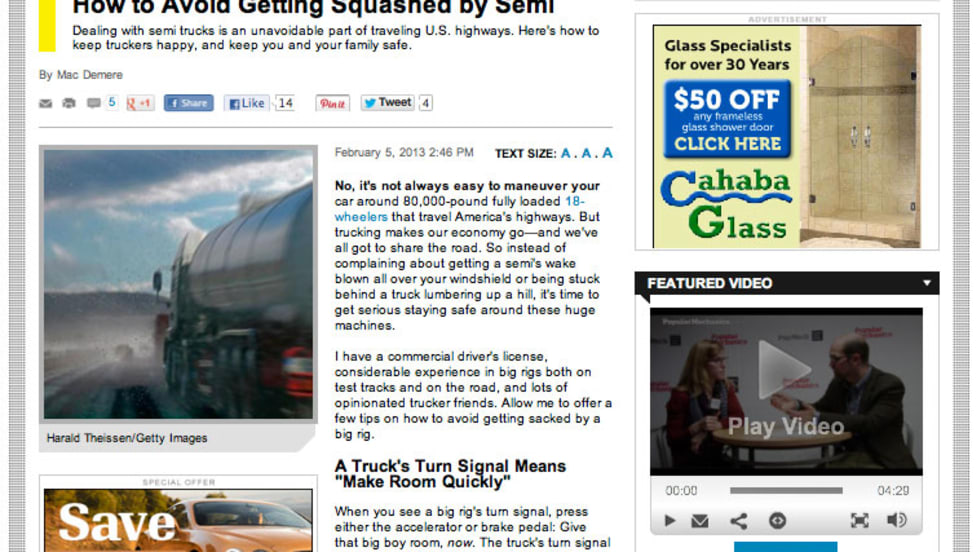 Read More →Popular Mechanics magazine, which takes on topics ranging from "Ab Machines That Work" to "How to Make Beer," now adds sharing the road with trucks to its repertoire.
