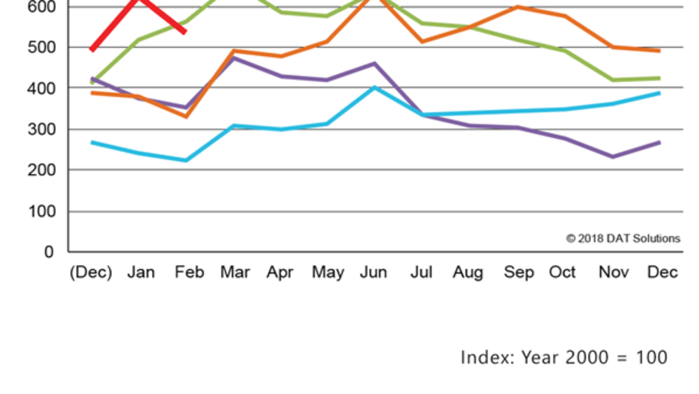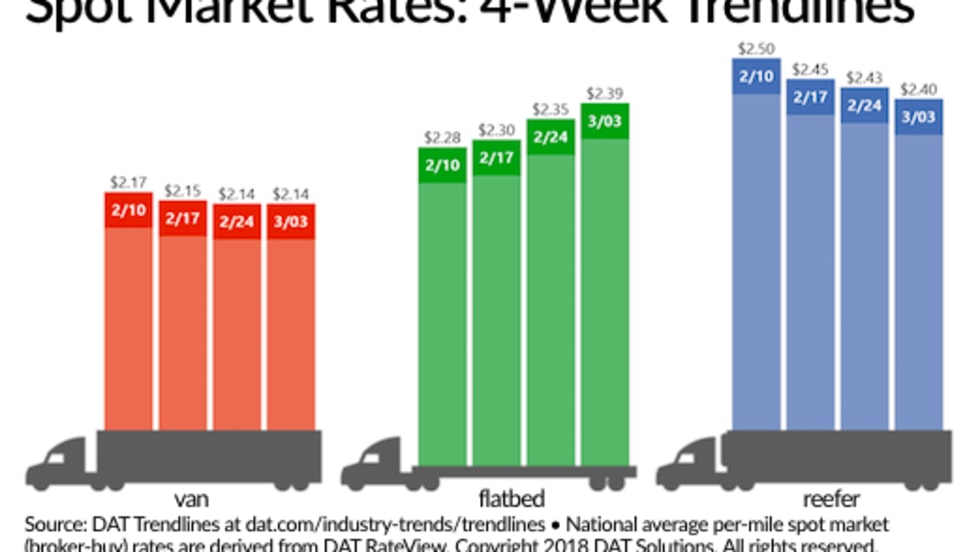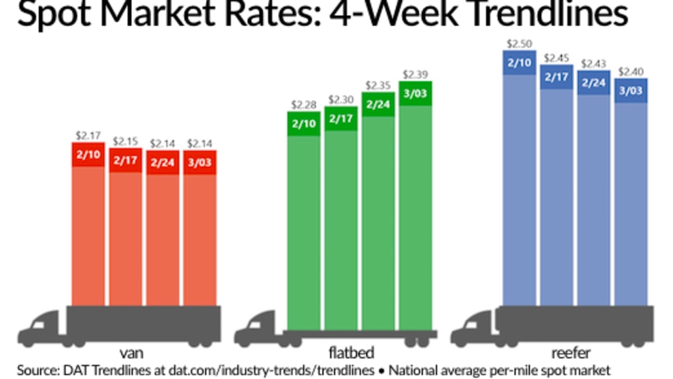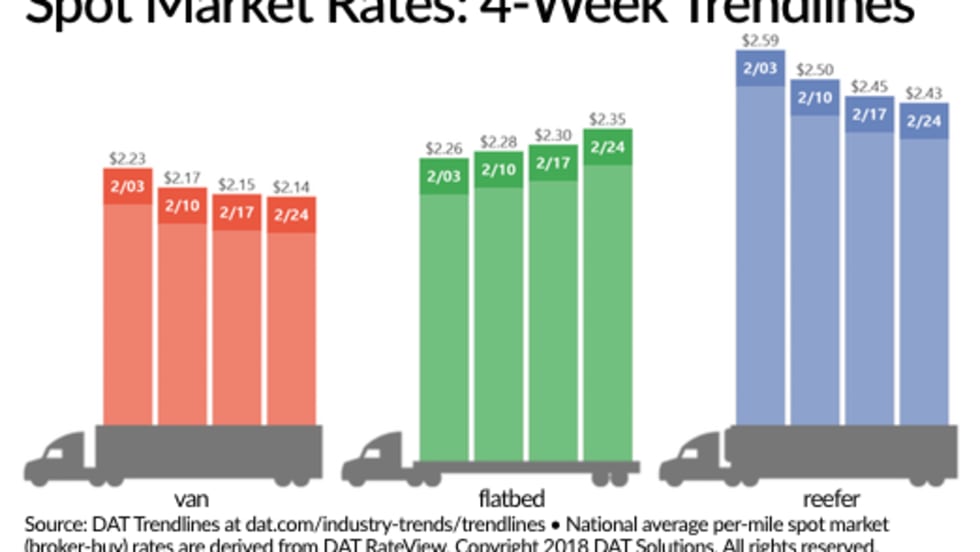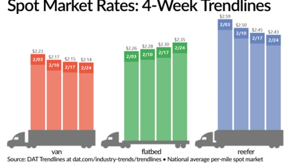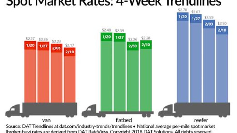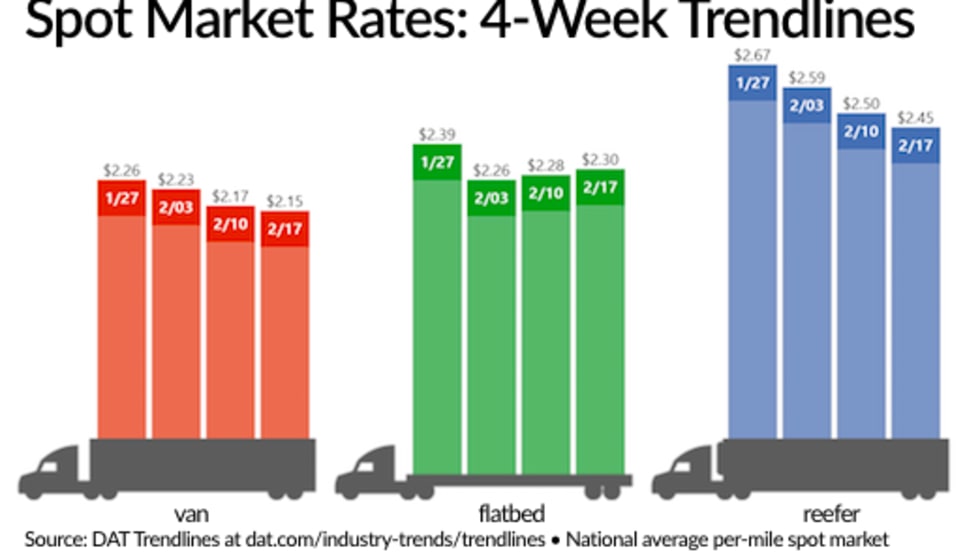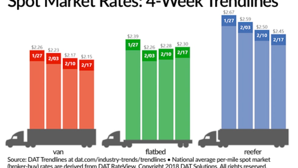 National average spot van and refrigerated truckload rates fell during the week ending Feb. 17 but remain well ahead of last year’s levels, according to DAT Solutions and its network of load boards.