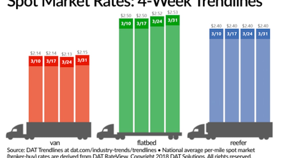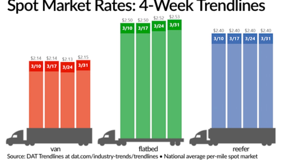 The number of trucks on the spot truckload freight market did not keep pace with demand from shippers wanting to move goods before the end of the first quarter and the start of Easter holidays, sending rates and load-to-truck ratios higher.