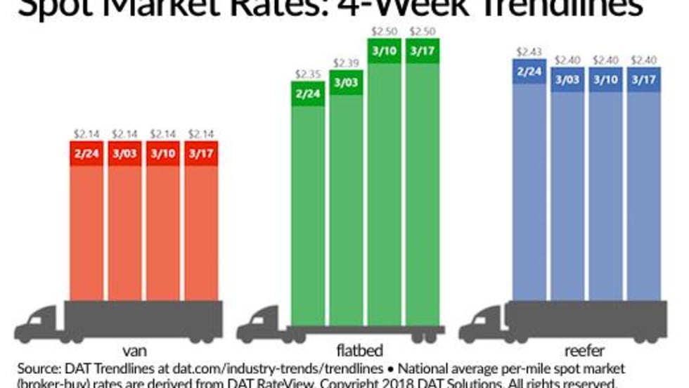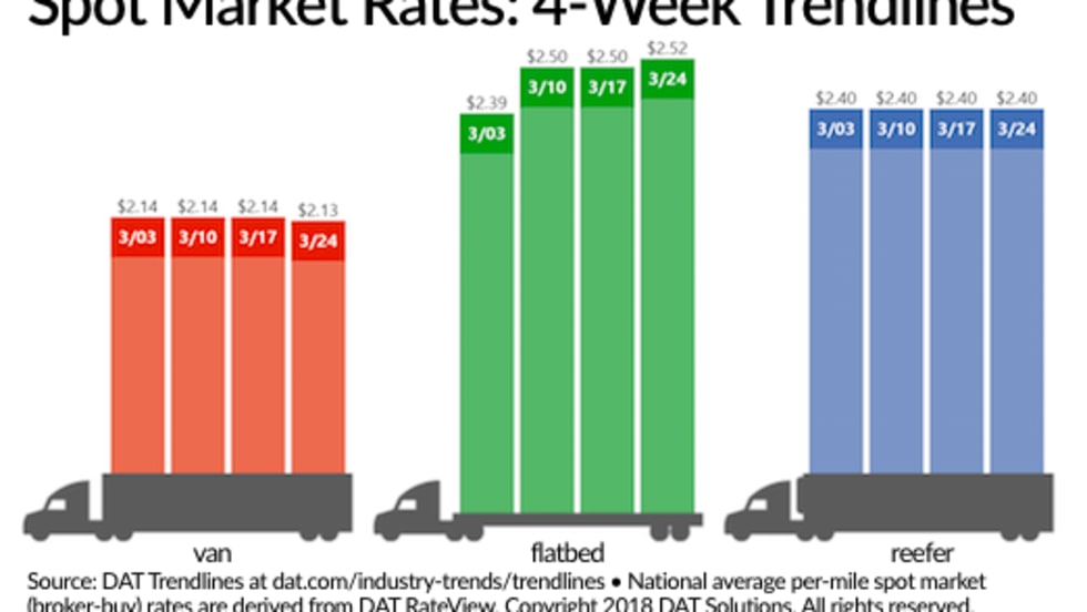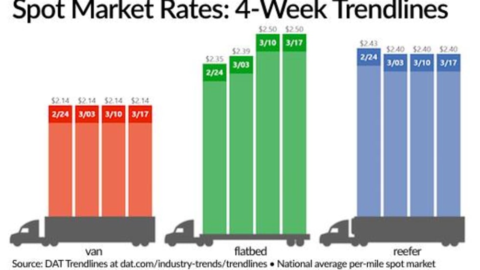 Read More →Spot truckload freight volume slipped 1.2% and truck posts increased 2% for the week ending March 17, according to DAT Solutions and its load boards, while load-to-truck ratios and rates were relatively even, although both are considerably higher compared to a year ago.