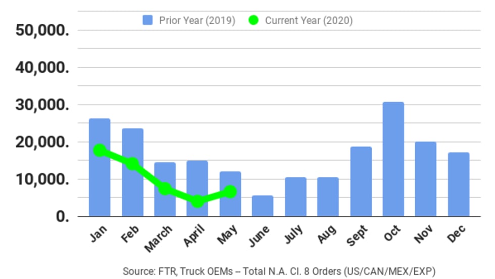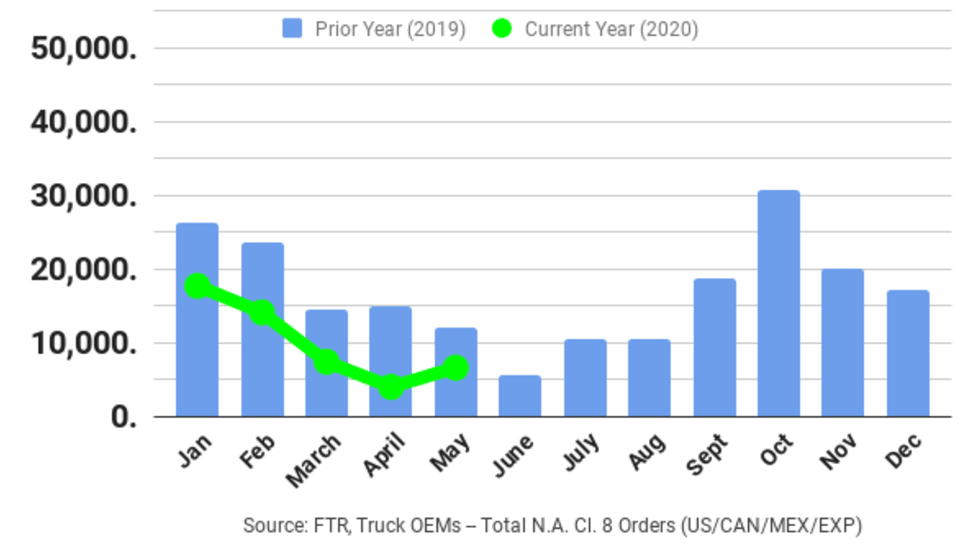 May orders for Class 8 trucks, while up significantly from the dismal April levels, were still down nearly 40% compared to last year, according to preliminary figures from ACT Research and FTR.