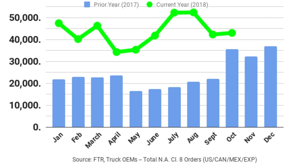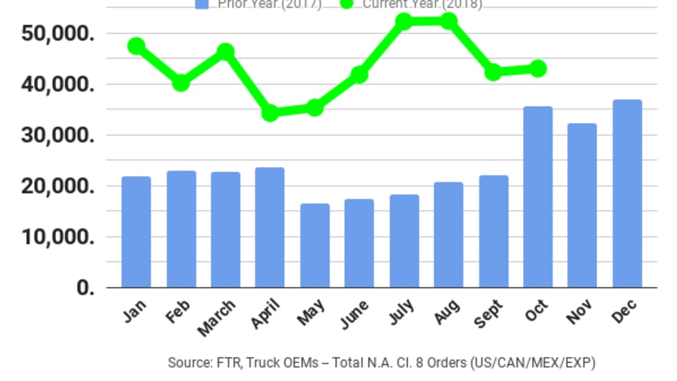 October Class 8 orders were above 40,000 units for the eighth month in a row, but two different companies reporting the data put rather different spins on their analysis of the numbers.
